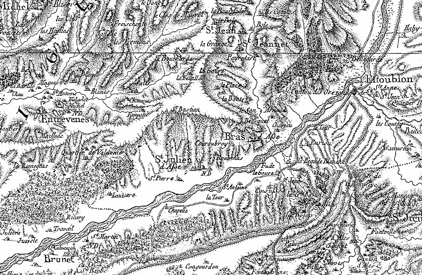 La carte de Cassini a été réalisée par quatre générations de Cassini. Elle est la première carte topographique du royaume de France, elle a été commandée par Louis XV en 1753 et n'a été publiée qu'en 1815. Ci-dessous un extrait de cette carte représentant la région de Saint-Julien-d'Asse.